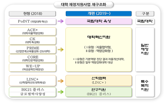 대학혁신지원사업은 기존에 진행되었던 ACE+ (자율역량강화), CK (특성화), CORE (인문), WE-UP (여성공학), PRIME(산업연계) 사업이 하나의 일반재정지원사업으로 통합·개편된 사업입니다.