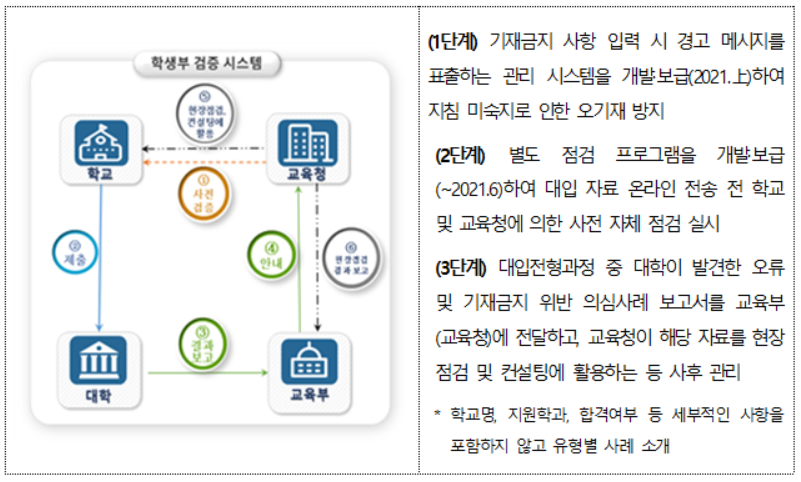 교육부는 이번 학종 추가 실태조사 결과를 17개 시도교육청 및 단위학교에 안내해 동일한 사안이 재발하지 않도록 조치하는 한편, 교육청의 학생부 현장 점검 체크리스트에 관련 내용을 반영해 지속적으로 기재 금지 사항의 기재여부를 점검할 계획이다. 아울러, 내년 상반기까지 3단계 검증 시스템을 도입해, 학생부 내 사교육 유발 및 공정성 저해 사항을 집중 점검·관리할 예정이다.