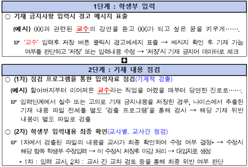 먼저, 교육부는 각 대학으로부터 제출받은 학생부 기재 파일(엑셀 파일)을 대상으로, 별도의 프로그램을 활용해 사교육 유발 및 대입 공정성을 저해할 수 있는 기재 사항들을 검출하였다.