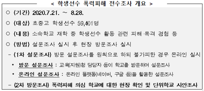 가해자에 대한 징계 등 후속조치를 진행하는 한편, 학생선수 폭력피해 실태조사의 주기적인 실시와 학생선수 및 학교운동부지도자에 대한 인권교육 강화, 폭력피해 발생우려가 높은 훈련장소 주요지점에 CCTV 설치, 가해자에 대한 불이익 강화방안 등을 검토하여 올해 연말까지 개선방안을 발표할 계획이다.