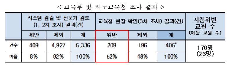 이어서, 현장 교사로 구성된 현장 전문가 자문단(13명)을 통하여 시스템 검출 결과물에 대한 확인 과정을 진행하였고, 시도교육청에서 보다 면밀한 위반 여부 판정을 위해 실재 학생부를 현장에서 확인하는 3차 조사를 진행하였다. 마지막으로 교육부는 각 교육청이 회신한 현장 방문조사 및 처분 결과에 대해 ‘조사 절차의 적정성’, ‘지침에 근거한 처분 여부’ 등을 점검함으로써, 엄정한 조사 및 처분이 이루어졌는지 확인하였다.