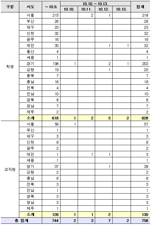 - 등교 이후 확진자 누계 10.13.(화) 00시 대비 학생 2명, 교직원 1명 증가 【누계 758명(학생 628명, 교직원 130명)】