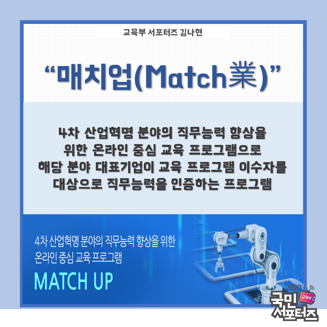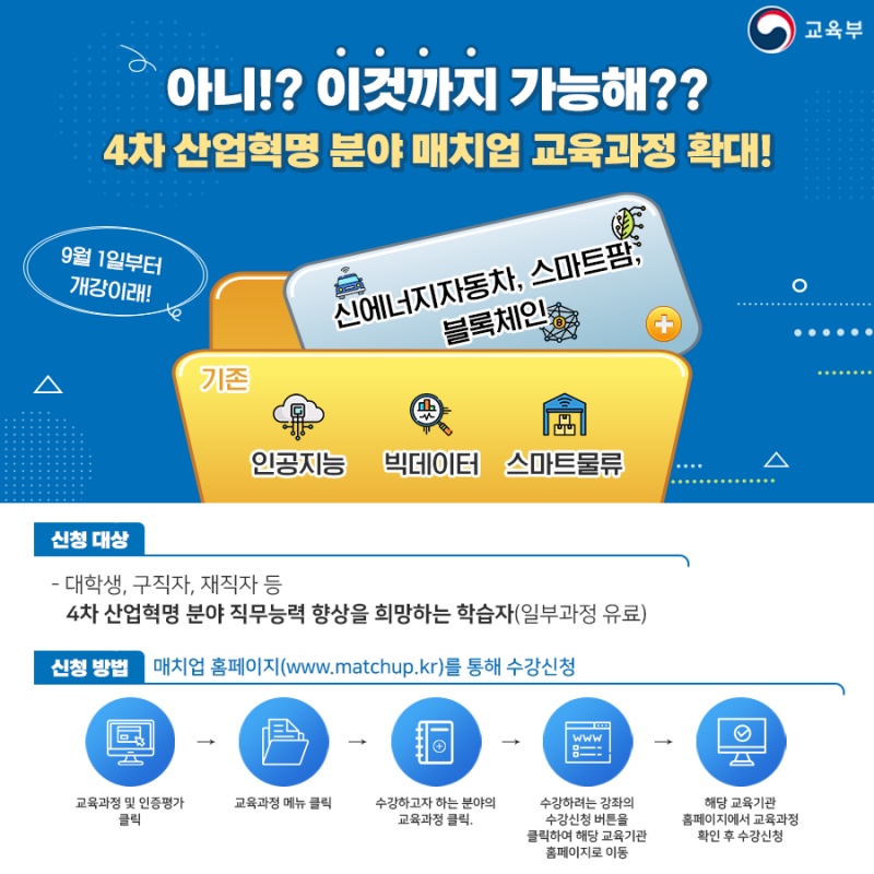 오늘은 대학생, 구직자, 재직자분들에게 유익한 교육정보를 준비했습니다. 이 글을 꼭 기억해두셨다가 활용하시면 좋을 것 같은데요. 혹시 “매치업”에 대해 들어보셨나요? 4차 산업혁명 분야에 관심이 많거나, 새로운 배움에 대한 갈증이 있으신 분들이라면 오늘 주목해 주세요!