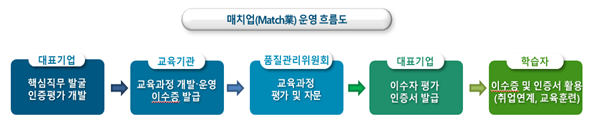 매치업은 4차 산업혁명 분야를 선도하는 기업이 핵심직무를 발굴하여 제시하고, 이를 바탕으로 교육기관이 교육과정을 개발하고 운영합니다. 또한 프로그램 이수자를 대상으로 직무능력 인증평가를 실시하고 그 결과를 인사제도 등에 활용하게 됩니다.