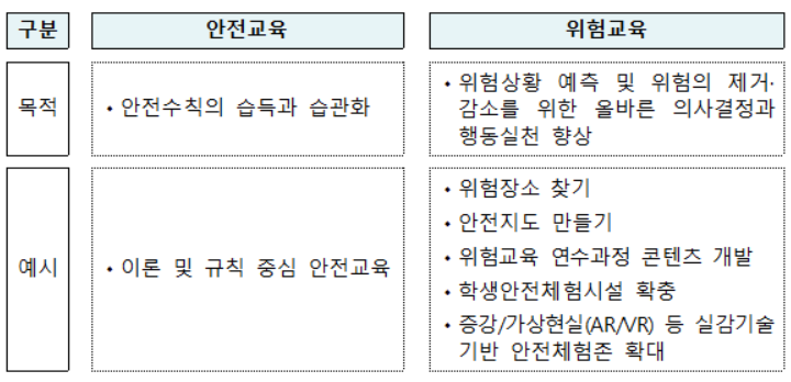 먼저, 단위학교 안전계획 수립 내실화, 지능정보기술 활용 기반(인프라) 및 안전문화 기반 조성으로 학교안전사고 예방활동을강화한다. 학교안전 실태조사와 안전사고 통계 분석결과 개별학교의 위험요소를 확인․진단하여 학교별 안전계획 수립에 반영함으로써 학교의 안전 개선활동을 지원한다.