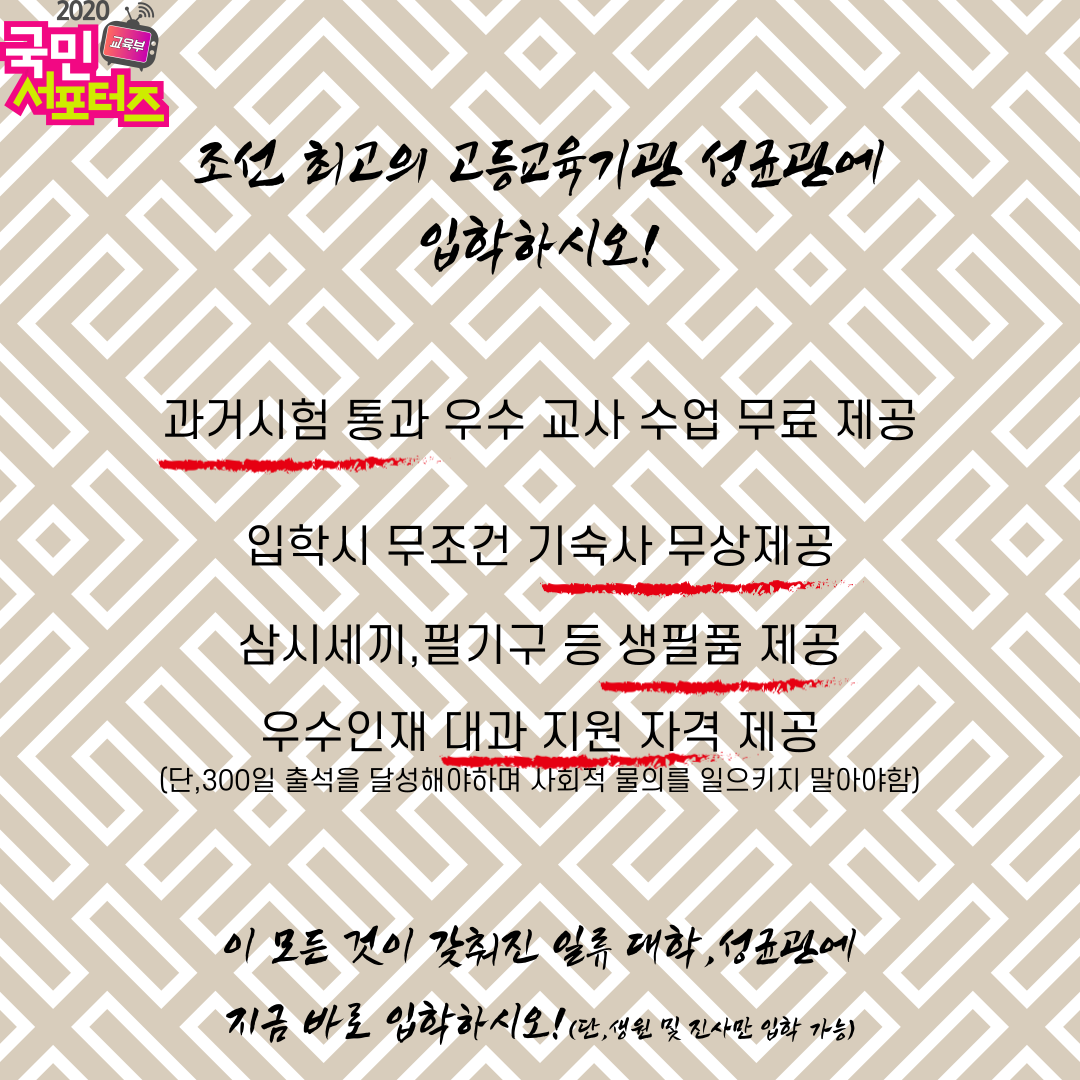 수업료 무료는 기본, 기숙사 입주와 필기구 등의 생필품도 제공 받았다고 하는데요, 또한 관리가 되는 시험인 대과 응시 자격까지 주어졌다고 합니다. 단, 출석을 잘 해야 하는 것은 물론이고 사회적 물의를 일으키지 않아야 하며, 시험 성적 또한 우수해야 했다고 합니다. 그만큼 유생들 간의 경쟁도 굉장히 치열했다고 해요.