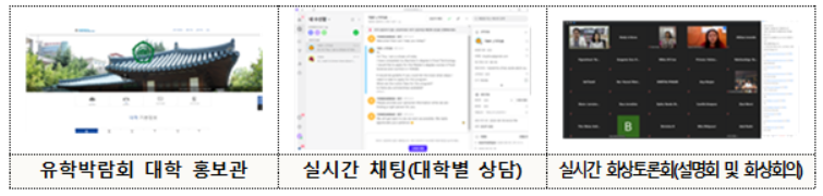 박람회 운영은 누리집(Study in Korea)*에 64개 참가 대학별특성을 담은 가상 홍보관을 마련하여, 입학 및 유학 관련 최신 정보 제공과일대일 채팅 상담등을 실시한다. 또한, 현지 시간에 맞춘 실시간 설명회 및 화상회의를 열어 한국의 대학 담당자들과한국유학을 희망하는 현지 예비 유학생들을 위한소통의 장도 마련된다.