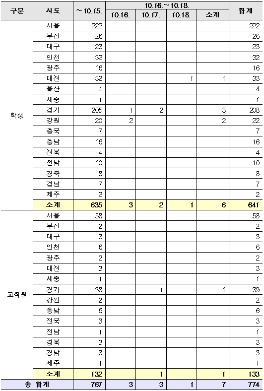 - 등교 이후 확진자 누계 10.16.(금) 00시 대비 학생 6명, 교직원 1명 증가 【누계 774명(학생 641명, 교직원 133명)】