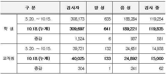 □ 등교 이후 진단검사 현황(10.19. 0시 기준)