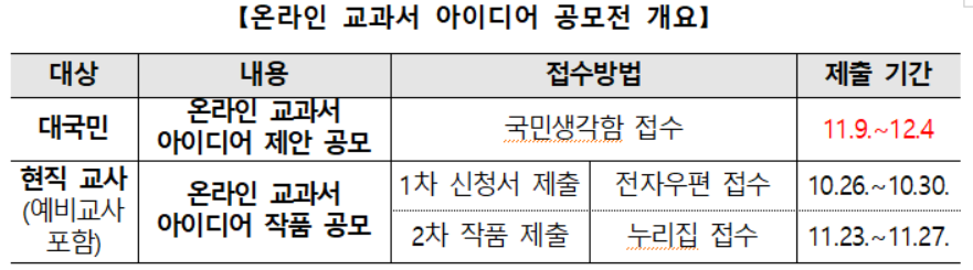국민이 제안한 ‘온라인 교과서 아이디어’에 대한 내부 심사를 통해 우수작을 선정하여 소정의 상품도 제공할 계획이다.