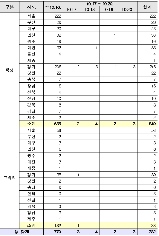 - 등교 이후 확진자 누계 10.20.(화) 00시 대비 학생 4명 증가【누계 782명(학생 649명, 교직원 133명)】