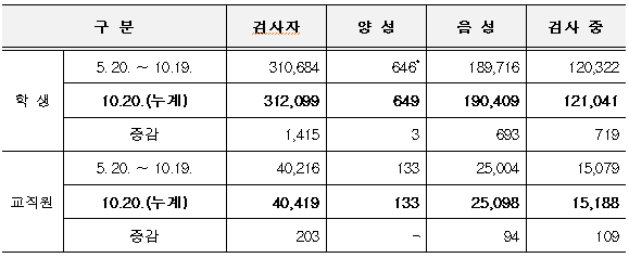 □ 등교 이후 진단검사 현황(10.21. 0시 기준)