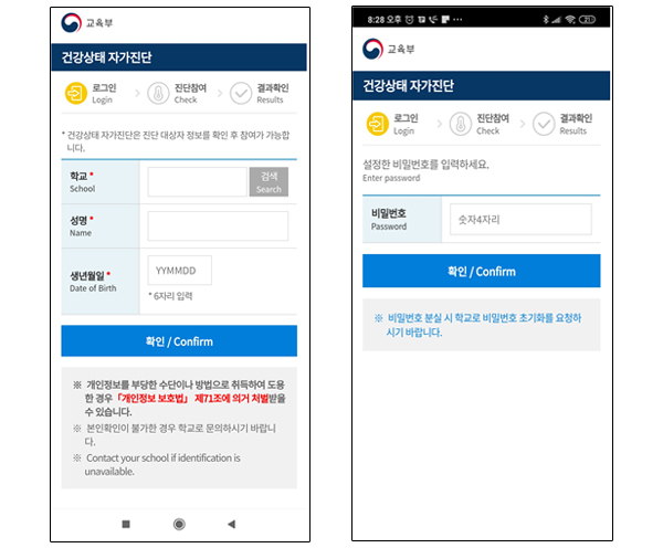 또한 편의성도 강화되었습니다. 기존 자가진단의 문제점은 자신이 자가진단을 한 것을 교사에게 보여줄 때, 교사가 전용 페이지로 접속하거나 캡쳐 파일을 확인하는 방식으로 확인해야만 했습니다. 이는 행정적으로 불편한 점이었습니다. 하지만 지금은 앱에서 비밀번호로 로그인만 하면 바로 확인이 가능해지는 등 편의성이 강화되었습니다.