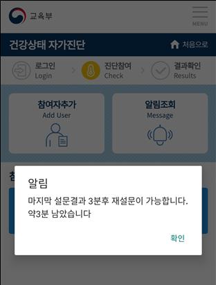 그리고 자가진단에 참여한 직후 3분 동안은 재설문이 불가능합니다. 따라서 본인의 현재 건강상태와 증상 여부를 꼼꼼히 잘 체크하면서 자가진단에 참여하는 것이 좋습니다. 또한 학생 이름 옆에 참여한 시간이 기록되기 때문에 자가진단을 전날 밤이나 새벽에 미리 진행해두는 것이 불가능하게 되었습니다.