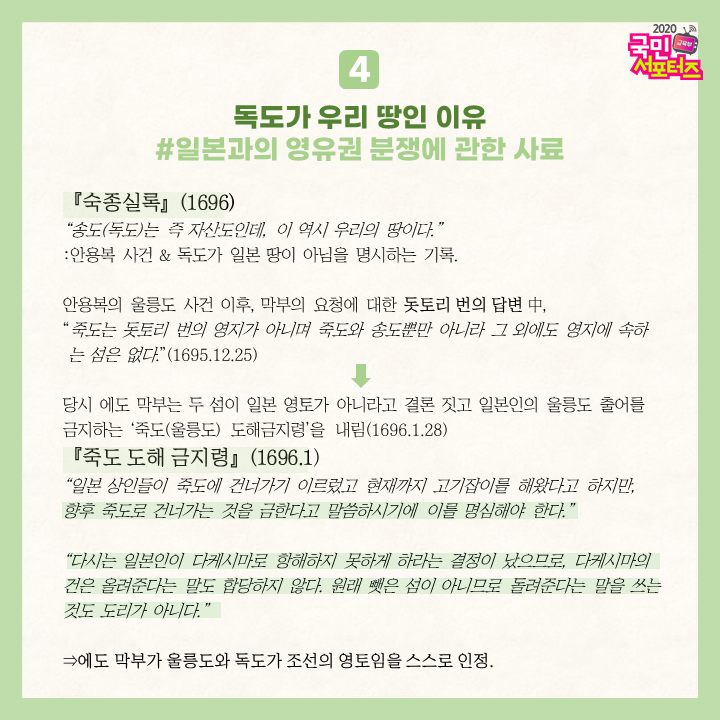안용복에 대한 기록은 '숙종실록'에서 찾아볼 수 있습니다. 또한 안용복의 요청에 대한 '돗토리 번'의 답변도 기록되어 있는데요. "죽도는 돗토리 번의 영지가 아니며 죽도와 송도뿐만 아니라 그 외에도 영지에 속하는 섬은 없다."라는 문장은 독도가 일본 땅이 아님을 인정하는 대목이기도 합니다. 그리고 앞서 언급한 '죽도 도해 금지령에서는 다케시마로 항해하지 못할 뿐 아니라, 원래 뺏은 섬이 아니므로 돌려준다는 말을 쓰는 것도 도리가 아니라고 하며, 과거에도 독도가 조선의 영토였음을 드러내고 있습니다.