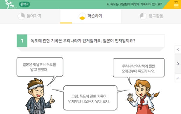 또한 '자료마당 > 동북아역사넷 > 동북아역사넷바로가기'를 클릭하면 동북아역사넷 웹사이트에 접속할 수 있습니다. 이 곳에서는 역사문제에 대한 역사교육콘텐츠를 무료로 이용 가능하며 그 중 독도교육을 선택하면, 초/중/고 학생을 대상으로 하는 독도 교육 온라인 자료를 이용할 수 있습니다. 위 사진처럼 영상 콘텐츠와 함께 가정에서도 재밌게 독도에 대한 학습이 가능합니다.