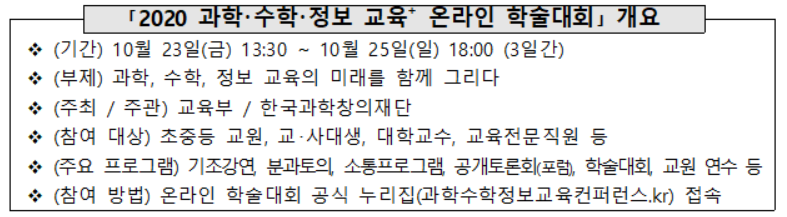 교육부(부총리 겸 교육부장관 유은혜)와 한국과학창의재단(이사장 직무대리 조향숙)은 10월 23일(금)부터 25일(일)까지 「2020 과학・수학・정보 교육+(더하기) 온라인 학술대회」(이하 온라인 학술대회)를 개최한다.