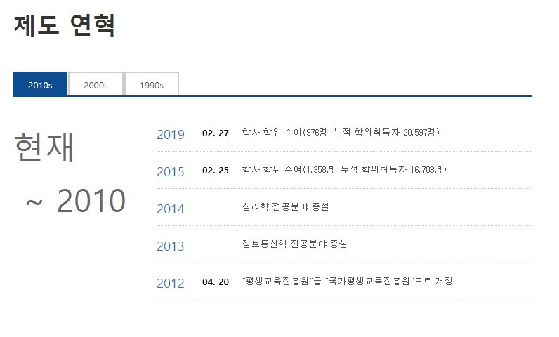독학학위제는 1990년 4월 독학에 의한 학위취득에 관한 법률이 공포되면서 시작되었습니다. 이후 같은 해 6월 중앙교육평가원에 학위검정부가 설치되었으며 10월에는 국어국문학, 영어영문학, 경영학, 법학, 수학, 가정학 총 6개 전공분야가 개설되었습니다. 1992년에는 행정학, 유아교육학, 전자계산학, 농학, 간호학 등 5개 전공분야를 증설하였고 1993년에 이르러 제 1회 학사학위를 수여하였습니다. 작년 2월 기준으로 독학학위제를 통한 학위취득자는 총 21,431명에 달합니다.