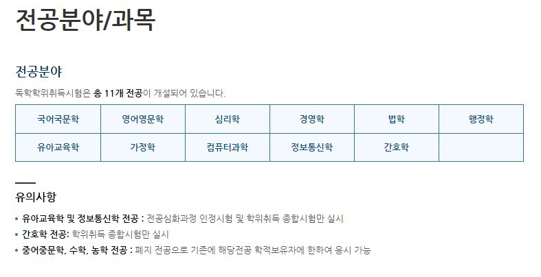 독학학위취득시험은 현재 총 11개 전공이 개설되어 있습니다. 구체적으로 국어국문학, 영어영문학, 심리학, 경영학, 법학, 행정학, 유아교육학, 가정학, 컴퓨터과학, 정보통신학, 간호학이 개설되어있습니다. 과거 중어중문학과 수학, 농학 전공이 개설되었으나 폐지 전공으로 기존 해당전공 학적보유자에 한하여만 응시가 가능합니다.