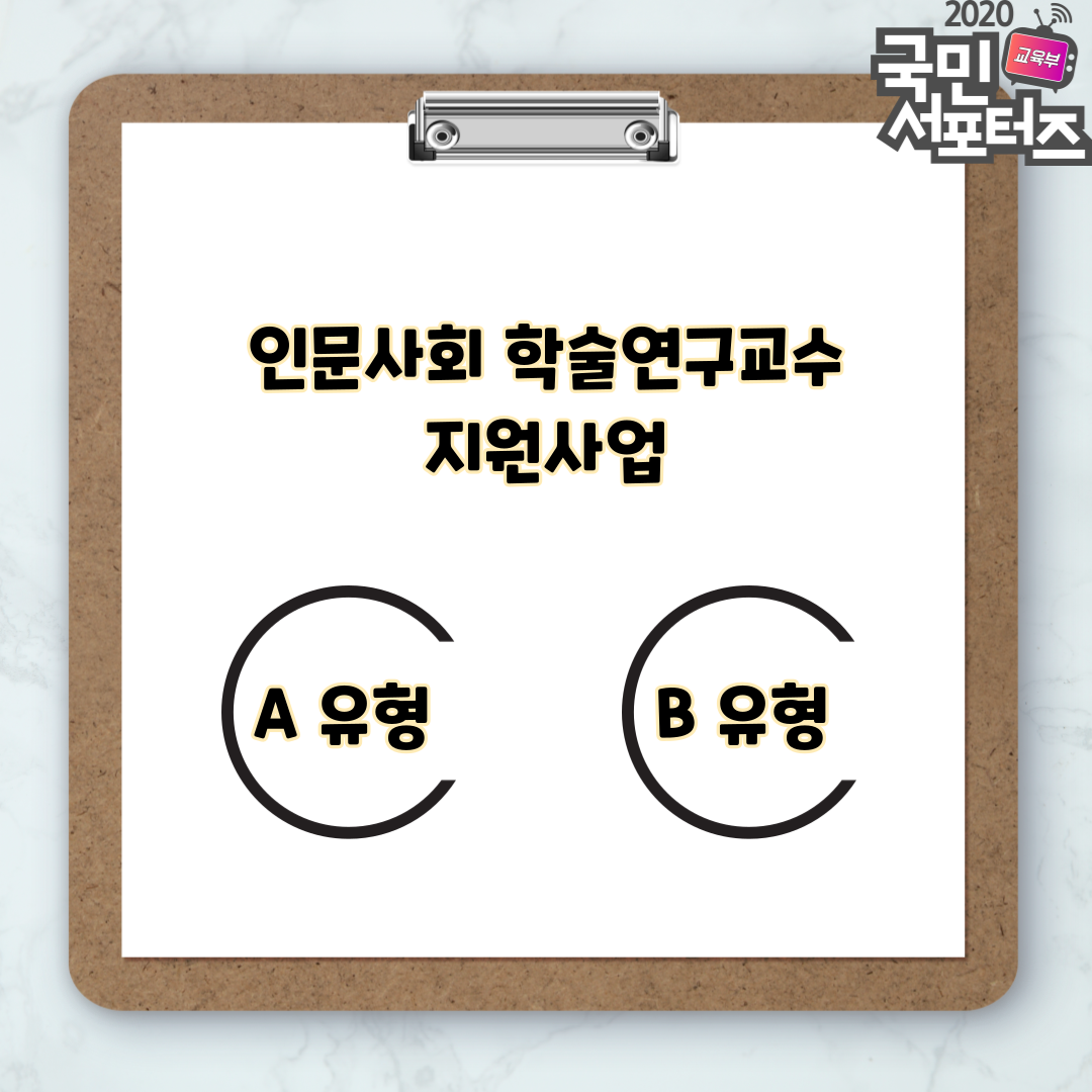오늘 조금 더 자세히 알아보려고 하는 ‘인문사회학술연구교수 지원사업’은 인문사회분야 학술연구지원사업의 세부 사업 중 하나인데요, 교육부와 한국연구재단이 지원하는 인문사회학술연구교수 지원사업의 목적은 크게 두 가지입니다. 첫 번째는 혁신성장의 근간인 학술연구의 토대를 강화하는 것이며, 두 번째는 학령인구 감소 등으로 인하여 늘어나는 대학 밖 비전임 연구자들이 연구 및 교육을 지속할 수 있도록 정책적으로 지원하는 것입니다. 이러한 인문사회 학술연구교수 지원사업은 지원규모 및 지원기간에 따라 A유형과 B유형으로 나뉘어 진행하고 있습니다. 어떤 부분에 있어 구분되었는지 알아볼까요?