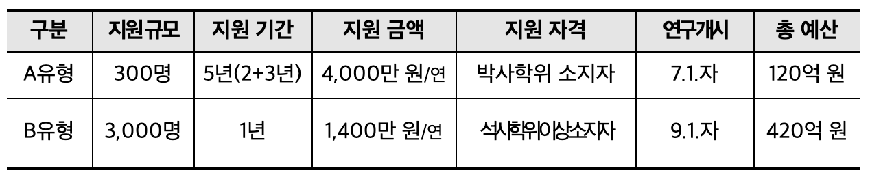 큰 차이점은 지원 기간에 있습니다. A유형은 장기로 지원기간은 총 5년(2+3년)이며, 국내·외 대학 박사학위 소지자가 지원가능합니다. 박사학위 취득 후 7년 이하인 신진 연구자는 A-1트랙, 박사학위 취득 후 7년이 초과한 연구자는 A-2트랙으로 신청 가능합니다. 지원 과제수는 300개 이내이며, 연구개시는 7월 1일입니다.