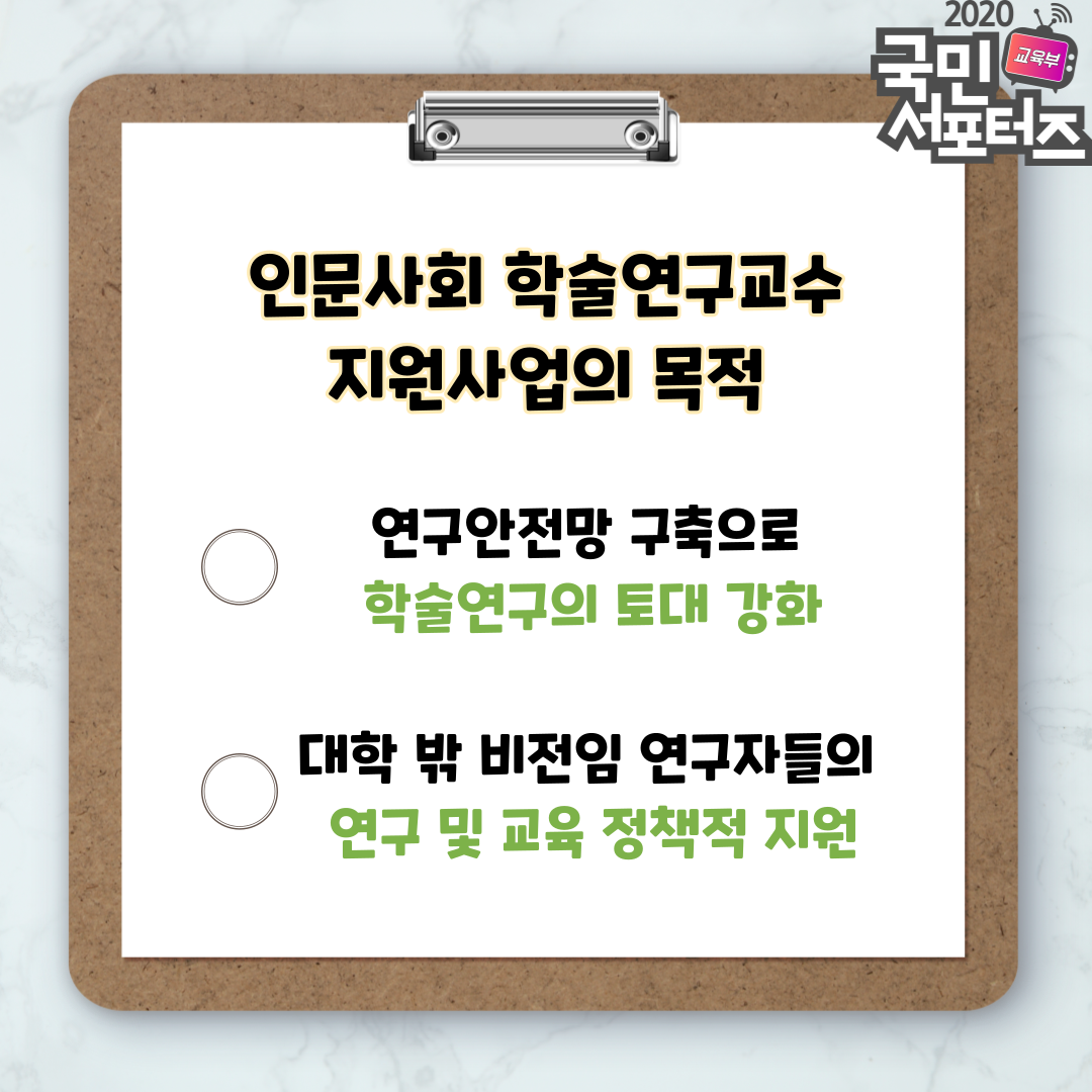 오늘은 이렇게 교육부와 한국연구재단이 함께하는 “인문사회학술연구교수 지원사업”에 대해 알아보았습니다. 학술지원을 통해 연구역량 강화와 학문 균형 발전을 유도하고 새로운 지식 창출에 이바지하여 변화와 혁신을 선도하는 교육부의 사업에 국민 여러분의 많은 관심 바랍니다.