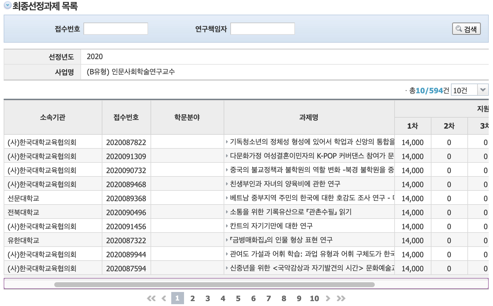 2019년 대비 투자 규모 141억 원 증가(7,847억→7,988억) 신진 연구자 지원 강화, 대학 연구기반 확대, 학문 균형발전 지원, 학술 성과 확산에 중점 투자 교육부(부총리 겸 교육부장관 유은혜)는