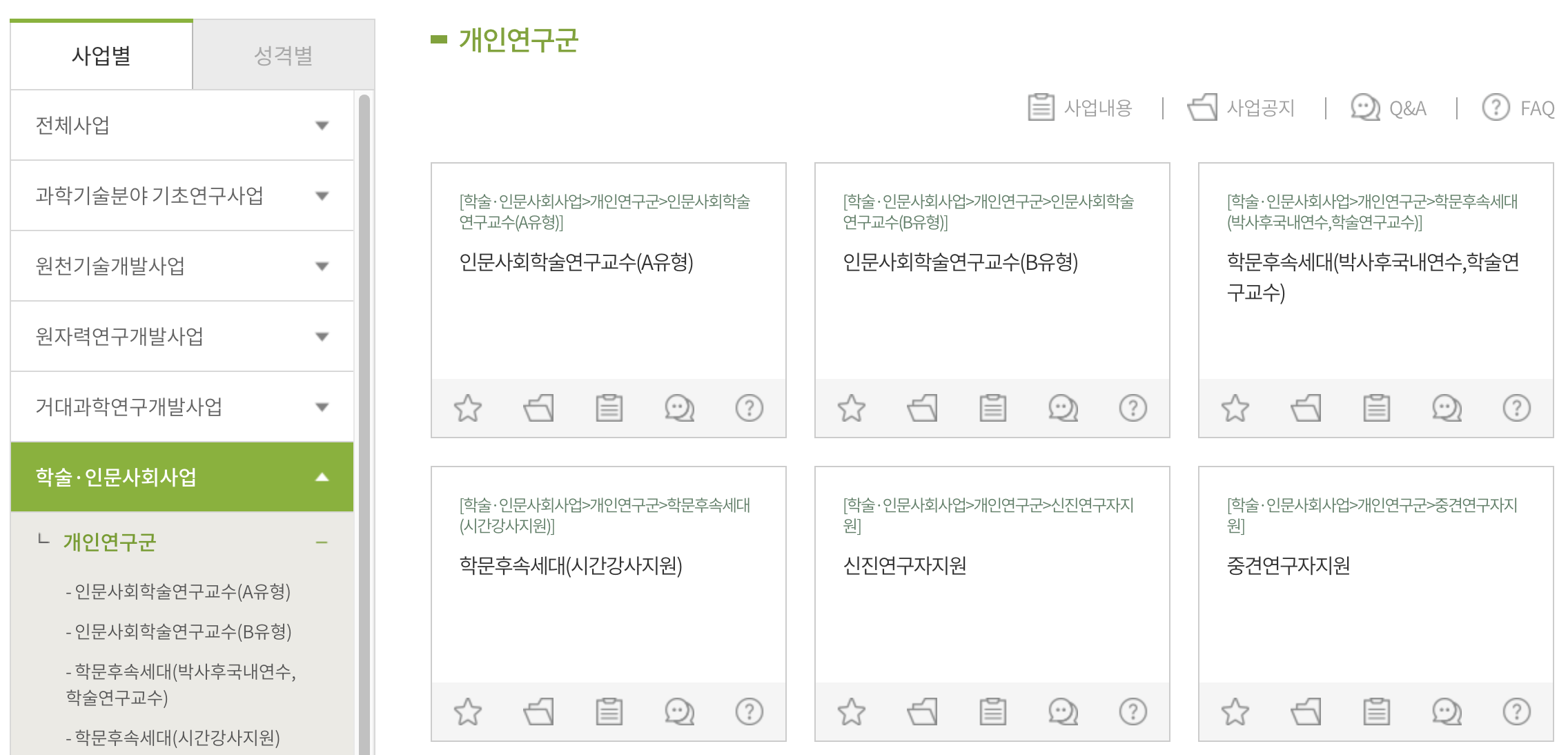 한국연구재단 홈페이지 상단 “사업안내”를 클릭, 전체사업 분류 중 학술·인문사회사업을 선택합니다. 화면 상의 “인문사회학술연구교수(A유형)”, “인문사회학술연구교수(B유형)”을 선택하시면 세부 정보를 확인할 수 있으며, “사업공지”를 선택하면 세부사항을 한 눈에 파악할 수 있어 편리합니다.