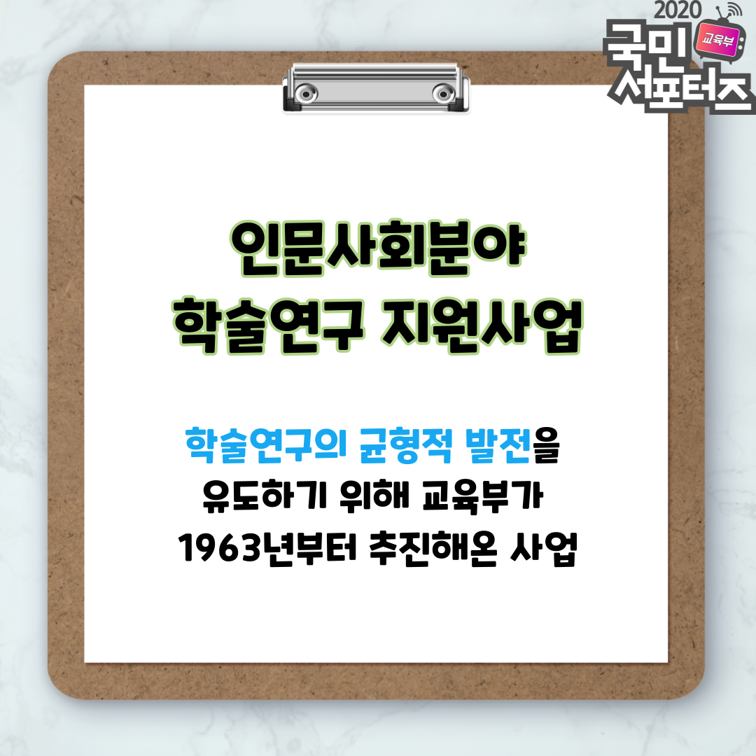 먼저 ‘인문사회분야 학술연구지원사업’은 학술연구의 균형적 발전을 유도하기 위해 교육부가 1963년부터 추진해온 사업입니다. 상당히 오랜 기간에 걸쳐 진행되고 있는 사업으로, 교육부는 우리나라의 인문사회 학술생태계의 활성화를 위해 노력하고 있습니다. 이러한 사업을 설계한 이유는 창의적, 도전적이고 연구력이 높은 학문후속세대 연구자들이 연구 활동을 단절하는 일이 없도록 연구 안전망을 구축하여, 경쟁력 있는 연구자들을 체계적으로 육성하기 위함입니다.