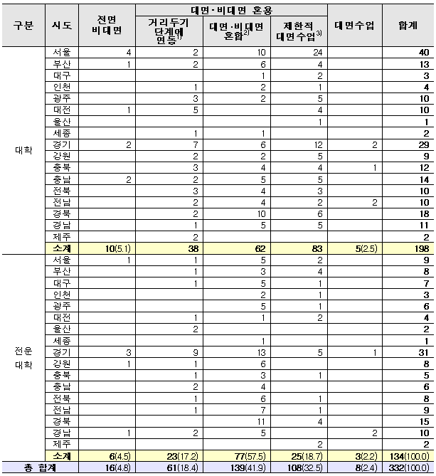 ※ 10.19.자 현황 : 전면 비대면 22교(6.6%), 거리두기 단계에 따라 결정 57교(17.2%), 대면·비대면 병행 123교(37.0%), 실험·실습·실기만 대면 123교(37.0%), 대면 7교(2.1%)