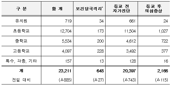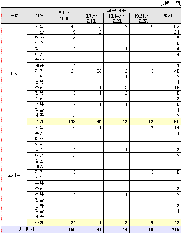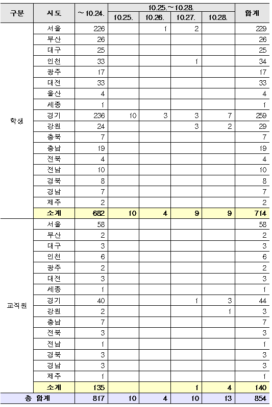 - 등교 이후 확진자 누계 10.28.(수) 00시 대비 학생 11명, 교직원 4명 증가 【누계 854명(학생 714명, 교직원 140명)】