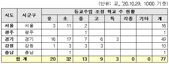 - 10.28.(10시 기준)70교에서 7교 증가(17교 등교수업 조정, 10교 등교수업 개시)