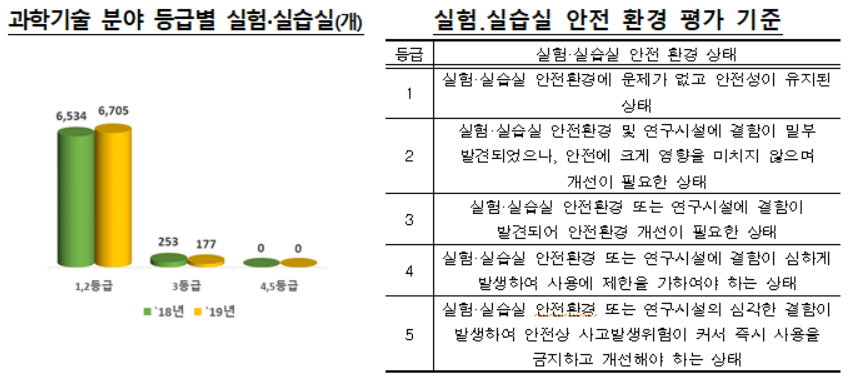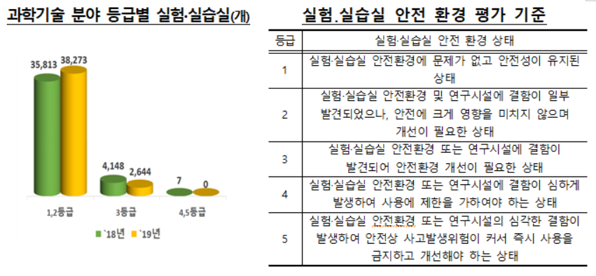 2019년 과학기술, 예·체능 및 기타 분야 실험·실습실 안전 환경 평가 결과, 1·2등급은 38,273개(93.5%)로 전년(35,813개)보다 2,460개 증가했다.