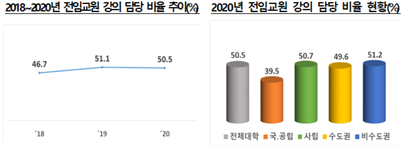 설립 유형별로는 사립대학의 전임교원 강의 담당 비율이 50.7%로 국공립 대학(39.5%)보다 11.2%p 높았으며, 소재지별로는 비수도권 대학의 전임교원 강의 담당 비율이 51.2%로 수도권 대학(49.6%)보다 1.6%p 높았다.