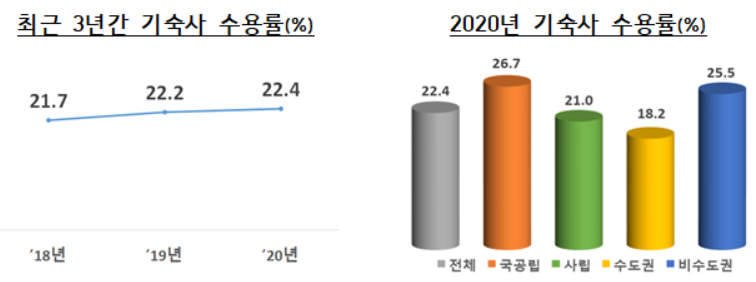 2020년재학생 수 대비 기숙사 수용가능 인원의 비율을 나타내는 기숙사 수용률은22.4%로, 전년(22.2%)보다 0.2%p 상승했다.