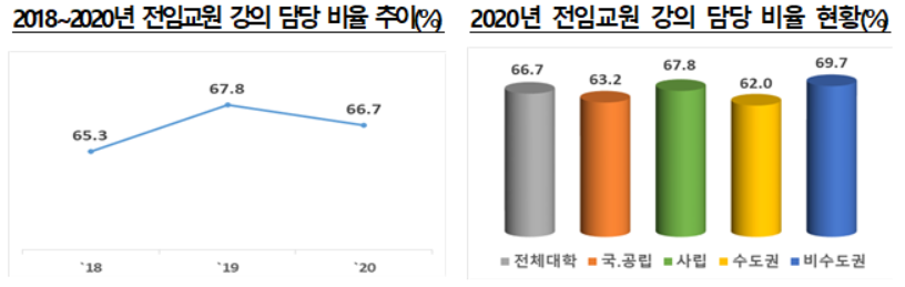 설립 유형별로는 사립대학의 전임교원 강의 담당 비율이 67.8%로 국공립 대학(63.2%)보다 4.6%p 높았으며, 소재지별로는 비수도권 대학의 전임교원 강의 담당 비율이 69.7%로 수도권 대학(62.0%)보다 7.7%p 높았다.