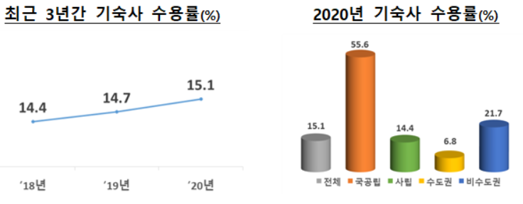 국공립대학의 기숙사 수용률은 55.6%로 사립대학(14.4%)보다 41.2%p 높았고, 비수도권 대학의 기숙사 수용률은 21.7%로 수도권 대학(6.8%)보다 14.9%p 높았다.