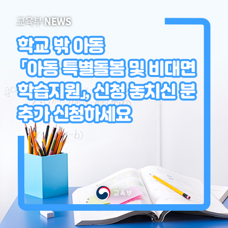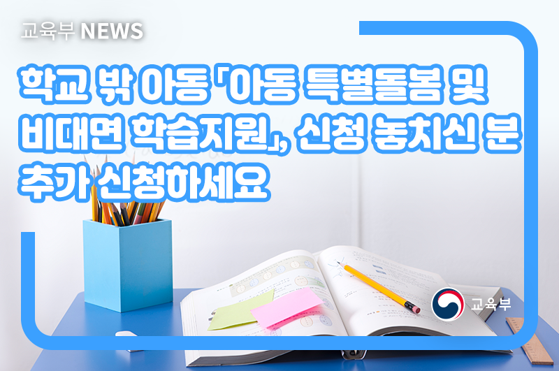교육부(부총리 겸 교육부장관 유은혜)는 4차 추가경정예산을 통해 지원하고 있는 학교 밖 아동 대상 「아동 특별돌봄 및 비대면 학습 지원」의 추가 신청‧접수를 11월 3일(화)부터 11월 13일(금)까지 실시한다.