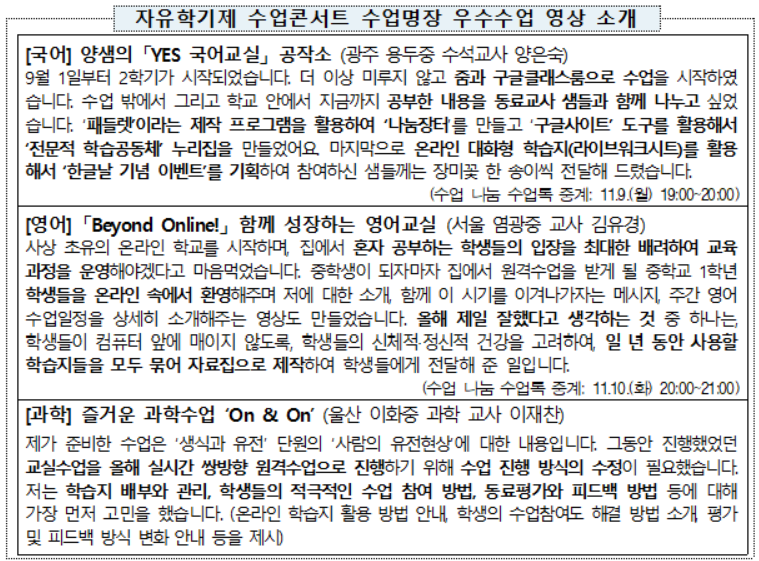 이번 ‘수업콘서트’는 코로나19로 원격수업이 전면 시행된 상황에서도 현장 교원의 열정과 노력을 통해 이루어진 학생 참여중심의 다양한 자유학기 수업 및 온오프 연계 수업 사례를 공유하고 확산하는 데 중점을 두었다. 온라인 수업 축제 운영 기간 동안 시도교육청 추천 수업명장 교사의 수업 영상(24편)을 누리집에 탑재하여 공유하고, 수업명장과 함께 수업 운영 방법, 수업 관련 질의‧응답, 수업 고민 등을 이야기하며 소통하는 실시간 수업 나눔 수업톡*을 운영한다.
