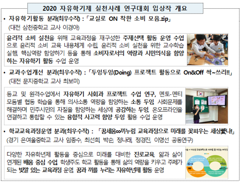 또한 교육청 추천자유학기 교과 및 영역별 활동우수수업‧평가 사례(11건) 및 자유학기제 실천사례 연구대회 입상작(8건) 발표를 실시간 유튜브영상으로 중계하고 ‘수업콘서트’ 누리집에 탑재하여 공유한다.