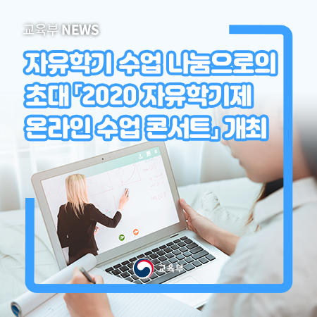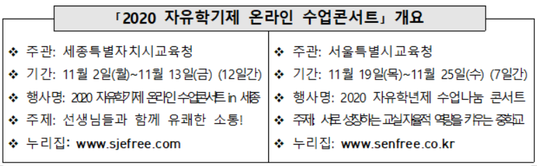 교육부(부총리 겸 교육부장관 유은혜)와 세종특별자치시교육청(교육감 최교진)․서울특별시교육청(교육감 조희연)은 11월 2일(월)부터 11월 25일(수)까지 「2020 자유학기제 온라인 수업 콘서트」를 개최한다. 올해로 다섯 번째를 맞이하는 자유학기제 수업 콘서트는 전국의 많은 선생님들이 참여할 수 있도록 온라인으로 개최하며, 교실 수업의 변화를 위해 노력한 교원의 수업 사례를 함께 나누고 자유학기에 대한 의견을 공유하기 위해 마련하였다.