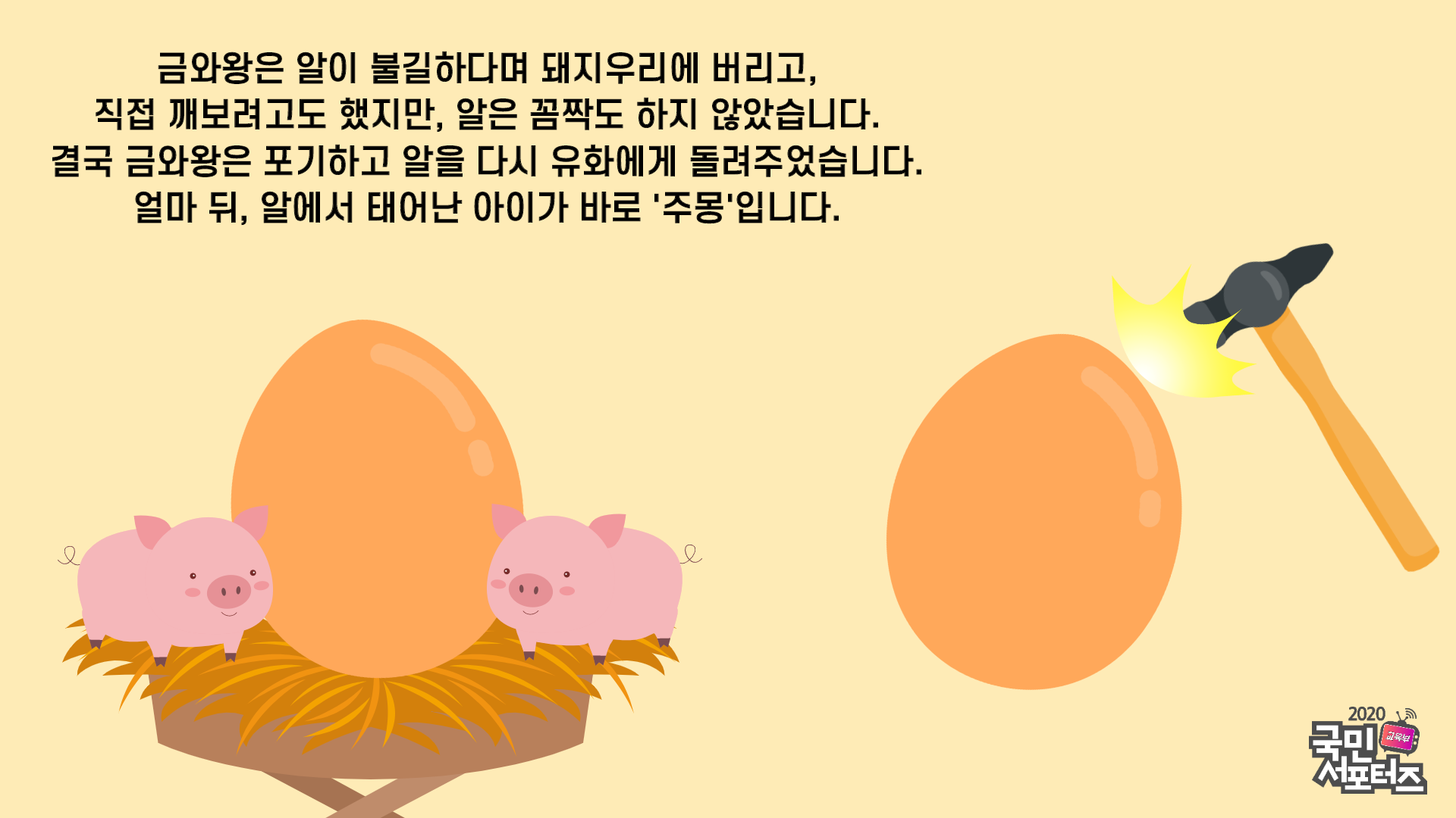 오래 전, 물의 신 하백의 딸이었던 유화와 하느님의 아들인 해모수는 서로 사랑에 빠집니다. 둘은 결혼을 했지만, 해모수가 다시 하늘로 돌아가야 하는 바람에 유화와 헤어지게 되었습니다. 그때, 우연히 유화를 본 동부여의 왕인 금와왕이 유화를 궁으로 데려옵니다. 궁으로 돌아온 유화는 아이를 낳는데, 신기하게도 유화의 몸에서 나온 것은 알이었습니다.