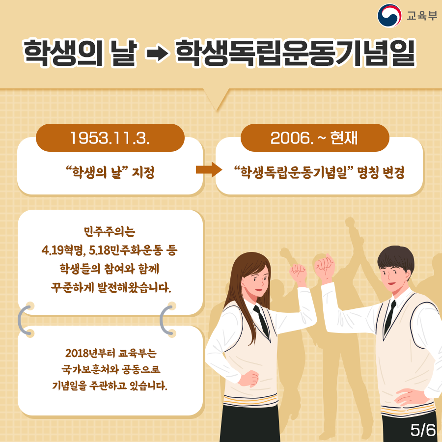 1953년 11월 3일, '학생이 날' 지정 → 2006년부터 현재, '학생독립운동기념일' 명칭 변경