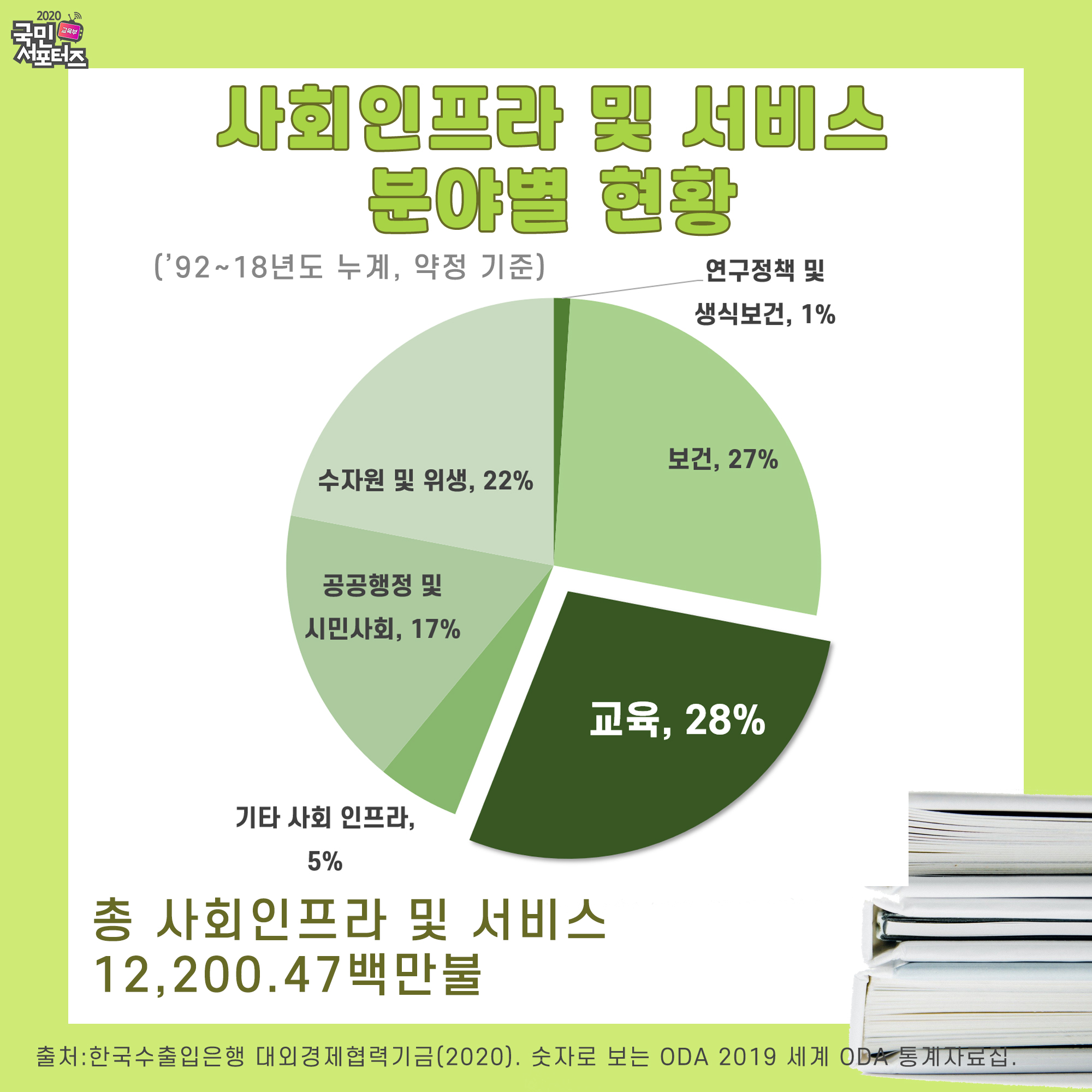 교육 ODA는 수자원 및 위생, 공공행정 및 시민사회, 보건 등의 분야와 함께 보통 사회인프라 및 서비스로 분류되어 보고되고 있습니다. 한국은 1992년부터 2018년까지 사회인프라 및 서비스 분야에서 12,200.47백만 불을 지원했는데요, 그중 28%가 바로 교육 분야 ODA였습니다.