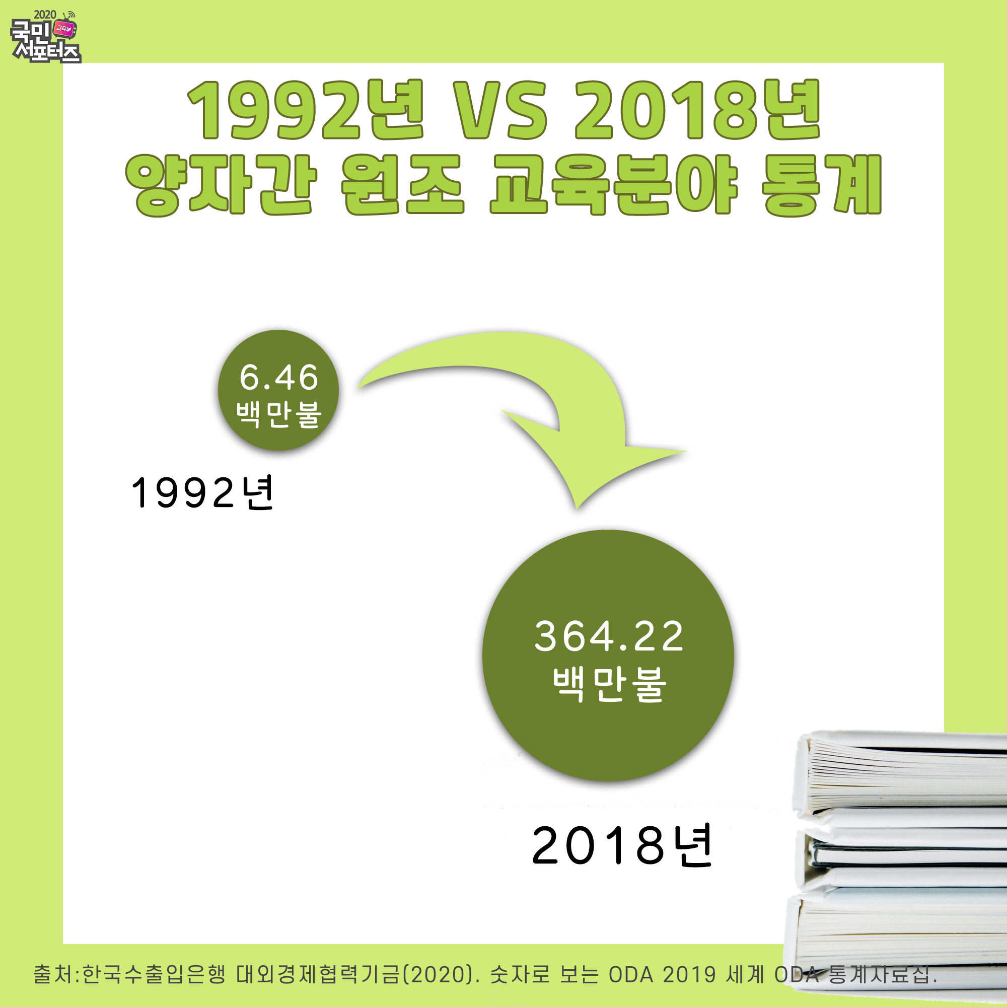 양자간 원조 사회인프라 분야에서 1992년과 2018년 교육 분야 원조 비용을 살펴보면 약 6백만 불에서 약 3백만 불로 대략 60배 정도 증가한 것을 확인할 수 있습니다. 전쟁으로 인해 수혜국이었던 우리나라가 불과 20여 년 사이에 60배의 양자간 원조를 하고 있다니, 대단하지 않나요?