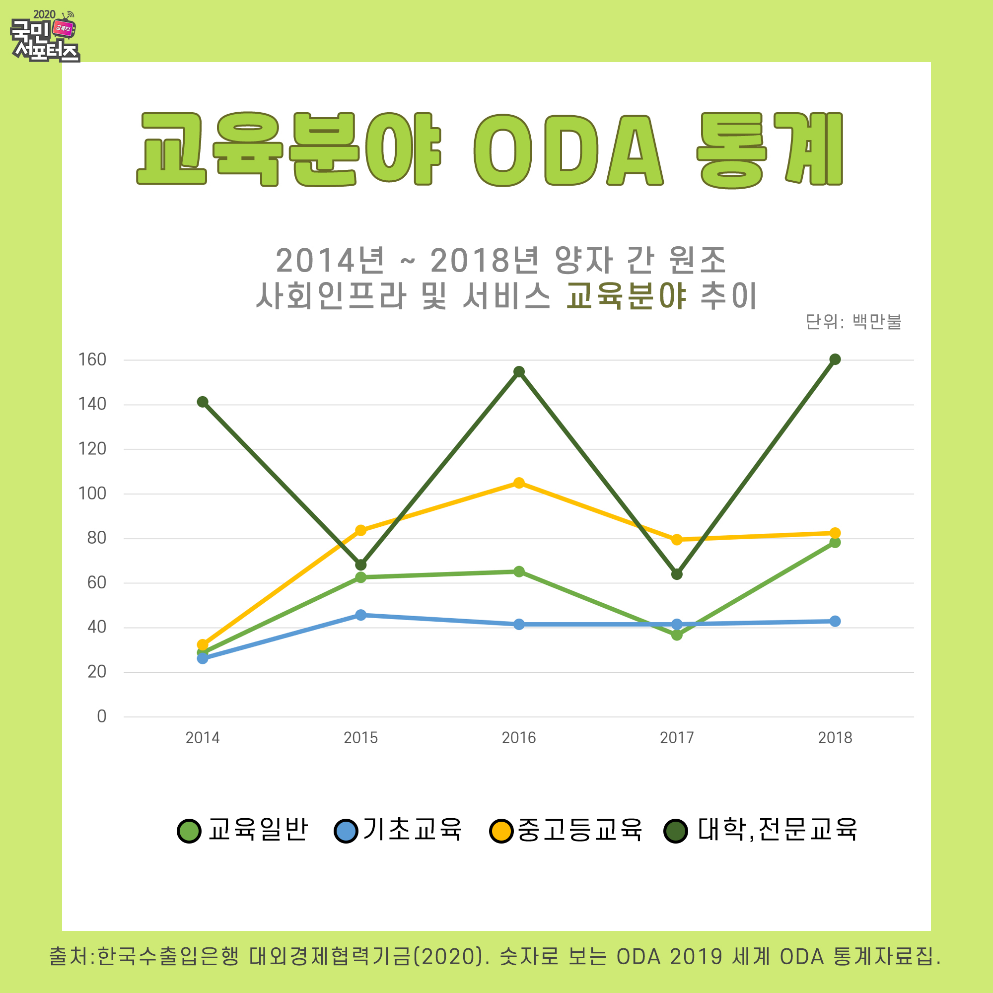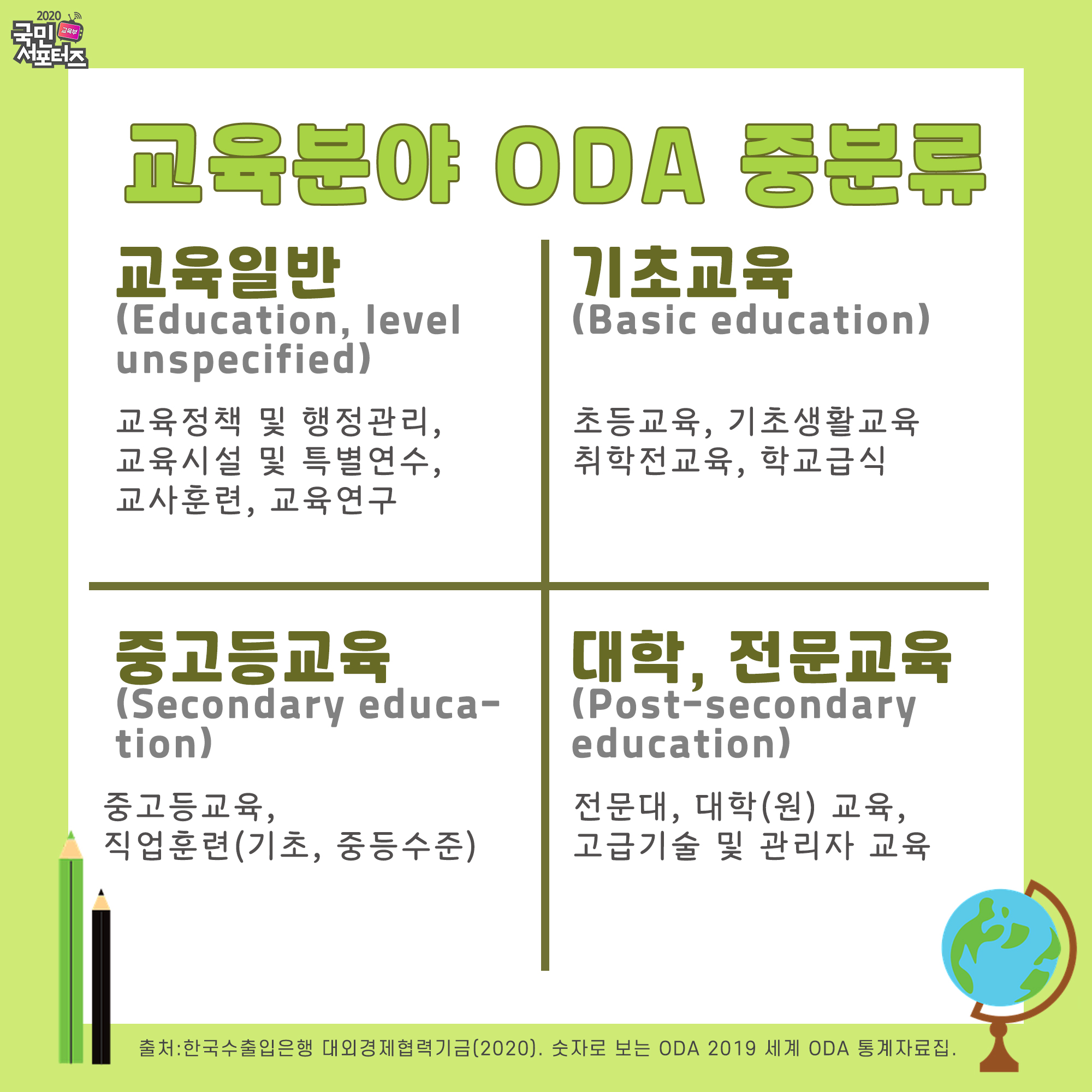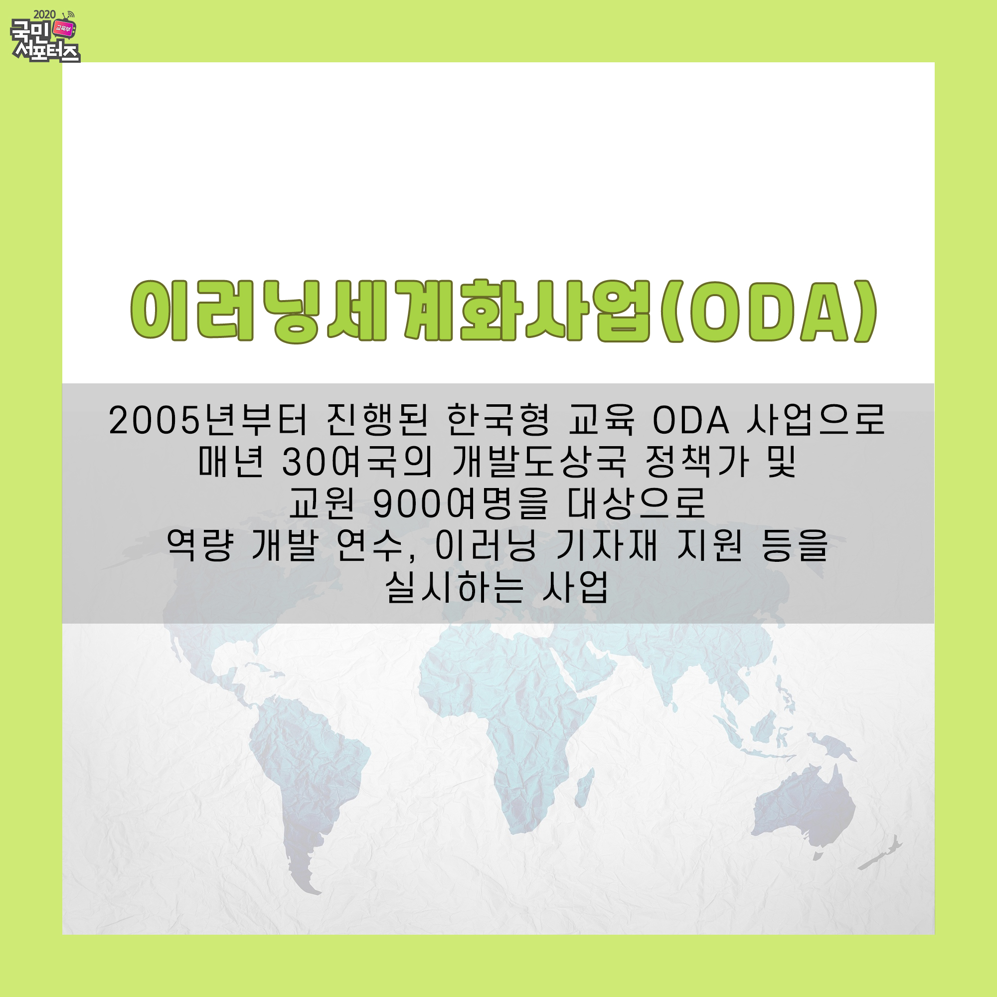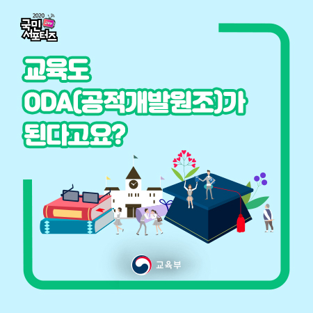 혹시 뉴스나 광고 등을 통해 ‘ODA’라는 단어를 접해보신 적 있으신가요? Official Development Assistance의 약자인 ODA는 한글로는 ‘공적개발원조’을 일컫습니다. 공적개발원조(이하 ‘ODA’)는 정부를 비롯한 여러 공공기관이 아직 산업의 근대화와 경제 개발이 잘 이루어지지 않은 국가인 개발도상국의 경제발전과 사회복지 증진을 위해 제공하는 원조를 뜻하며, 개발도상국 정부나 지역 혹은 국제기구에 자금을 제공하거나 기술협력 하는 것을 포함합니다. 우리나라는 2010년에 OECD 개발원조위원회(이하 ‘DAC’; Development Assistance Committee)에 가입하고, 국제개발협력 기본법을 제정함으로써 원조를 제공하는 공여국의 지위를 인정받았습니다. 그리고 올해 2020년이 바로 OECD DAC에 가입한 지 10년째 되는 해입니다. 그런데 여러분 혹시 그것 알고 계시나요? 바로 교육도 ODA가 된다는 사실!