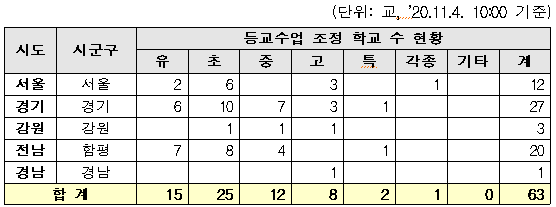 - 11.3.(10시 기준)63교에서 변동 없음(3교 등교수업 조정, 3교 등교수업 개시)
