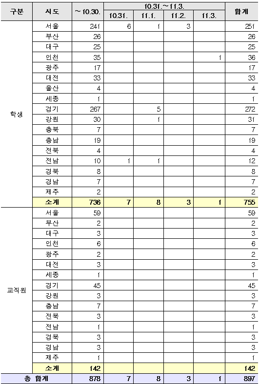 - 등교 이후 확진자 누계 11.3.(화) 00시 대비 학생 1명 증가 【누계 897명(학생 755명, 교직원 142명)】