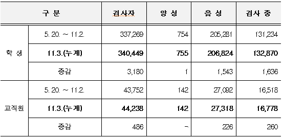 □ 등교 이후 진단검사 현황(11.4. 0시 기준)
