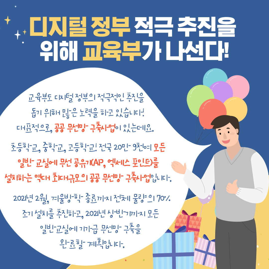 교육부에서는 디지털 정부 추진을 적극 지원하고, 체계적인 미래교육을 준비하기 위해 다양한 사업을 시행하고 있습니다. 대표적인 것이, 공공 무선망 구축사업인데요. 2021년까지 차세대 무선망 기술 표준인 ‘와이파이-6’ 기반의 무선 공유기(AP)를 설치하여, 교원들의 원격수업 기반을 획기적으로 개선하려고 합니다. 원격수업을 할 때에도 안정적으로 실시간 수업이 진행될 수 있고, 등교 수업시 여러 학생들이 동시에 무선망과 스마트 기기를 사용해도 빠른 속도의 통신을 지원할 수 있습니다.